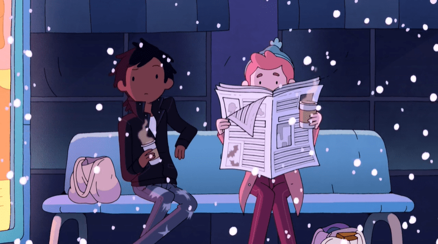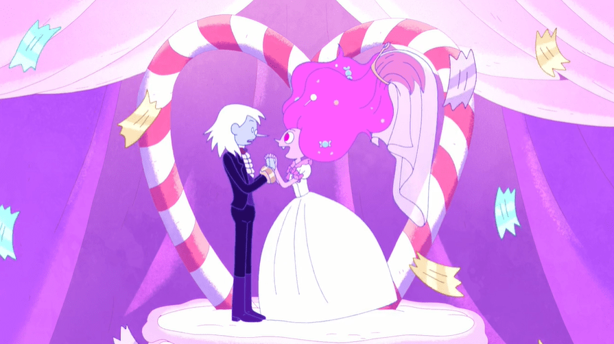 Alright, so we got all that out of the way, now it’s GaryLee (I think that’s the name of their ship?) time babies!! In a nutshell, I think that they’re very charming together. I don’t think any of the stuff with Fionna and Cake has been bad so far this season, but I’ve struggled to find a focal point in really caring about the human world that they’re leaving behind. That is until this episode – I think Gary and Marshall Lee hitting it off not only helps bring to light Fionna’s selfishness in wanting the world to be altered in her vision, but is also just very genuinely endearing on its own. So much of the original series, and even Distant Lands, has focused on the somewhat tumultuous aspects of Marceline and Bubblegum’s relationship. It’s nice to have a glimpse into their relationship that is fully committed to showing what makes them work. That’s not to say that the series has never emphasized these elements, because I think Obsidian and even episodes like Varmints or Broke His Crown do just that, but The Winter King breaks it down into very simplistic terms. At the beginning, it plays into their polar opposite personalities, being Gary’s by-the-book attitude and Marshall Lee’s laidback, often anarchistic nature. But soon, this blossoms into a mutually beneficial sharing of worldviews. Marshall values Gary’s commitment to bringing his own dreams to life while Marshall’s spontaneity helps Gary get out of his own desire for monotony. I especially like how the conflict that comes from this, being Marshall calling the Lemoncarbs without letting Gary know, doesn’t instigate drama between the two and instead is used for a quiet moment of open communication. I also really love how their part in the episode wraps up with Gary conceiving of Slumber Party Panic‘s plot through a vision of his pastry menschen. The continued sprinkled bits of ideas that aspects of the multiverse exist merely as ideas in the minds of “lower” beings is really cool to me, I would love to see that expanded on with the other cosmic characters at some point in a future series.
