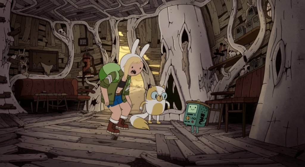 BMO in general is great to have back. I was a little miffed when I saw BMO in the trailer for the first season of F&C, because it really seemed like they were going to overly rely on characters from the OG series instead of fleshing out the newer ones. But my cynicism dissolved quickly, because BMO is always delightful. I’m not sure what it is about her, but I kind of have yet to see a poor portrayal of her. Besides some inconsistencies of how she acted at the beginning of the series versus now, her presence always seems to get the right blend of character traits down. It’d be so easy to just make BMO overly cutesy and whimsical or something, but she’s always a little bit of an asshole too, and there’s usually this subtle (or, in this case, overt) level of sadness that she carries with her. It’s extremely sad to watch the little dude mosey around amidst the destruction of Ooo, and I wonder how much BMO is able to actually grapple with it on a conscious level. I imagine her behavior is somewhat of a trauma response, but also just goes to show how far BMO’s imagination can be stretched to the point where I’m not sure if she’s really able to tell the difference/deal with such horrendous destruction in a way that involves legitimate grief. BMO referring to Fionna as “Finn” further supports the idea that she may not be able to differentiate reality from fiction, which was possibly heightened by her current surroundings as well.