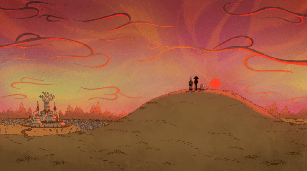 This is probably the best looking episode of the season as well. I love the way color and light really erupt within the confines of the cosmic realm, carrying on a lot of the visual identity we’ve seen from both Prismo and Cosmic Owl’s domains. I’ve talked a bit about the backgrounds, but haven’t given proper due to those who have put the effort into breathing life into them. Jesse Balmer played a big role in the visual development of the season, having worked on the last chunk of AT and did a bunch of stuff for Distant Lands. A lot of the concepts for landscapes in this one came from Balmer (mainly the dilapidated grass lands) while a team of BG designers also chipped in. Jarrod Prince, Craig Bowers, Udo Jung, and Nicholas Maniquis are are credited for design work on this one, each having a unique portfolio within the industry, with Maniquis even dipping his toes in Natasha Allegri’s other project, Bee and Puppycat. I really love the eerie look of Ooo that contrasts the vibrant colors within the cosmic realm; I’m using the word “contrast” a lot in this write-up, but there’s so many craftily placed divergences in tone, color, and form in this one that it’s hard to ignore. The way the clouds wrap around like dead vines while the sun beats down in inconsistent rays makes for an ugly bit of solemnity that really carries out the bleak tones it’s going for. This is an episode that is pretty light on score during the actual scenes in Ooo, and I think it’s all the better for it. I don’t mean it as another diss towards the soundtrack, but the hollowness of it all is only benefited by how infrequently music cues support it.