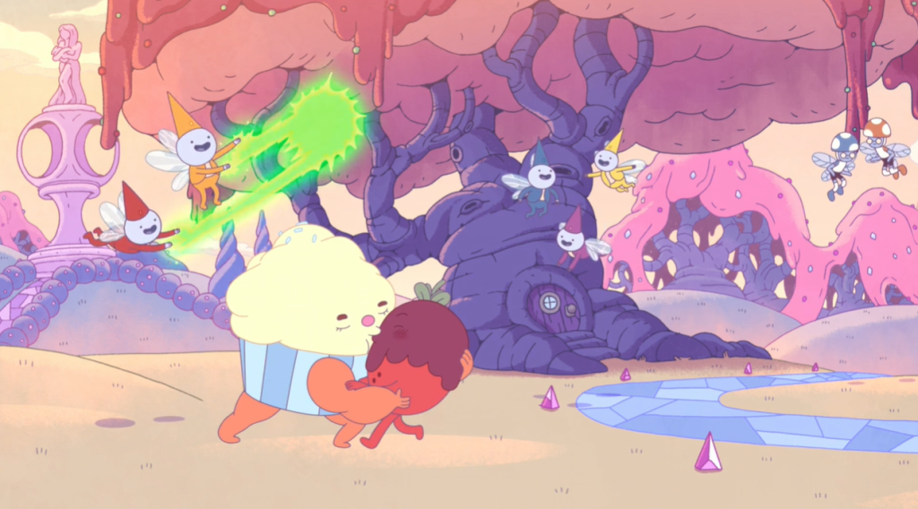 As mentioned, the rest of the episode mainly focuses on Cake exploring Ooo and discovering her own self. It’s a lot of moments that, in my opinion, mostly feel unnecessary to explore. Like, was the exposition of Cake trying different size-altering fruits and acknowledging that she enjoys shapeshifting something that we needed to see happen? Or even her feeling at home with the magic surrounding her, only to be ganged up against by the very beings that made her feel inspired? I feel like most of what is established here can be cooked into Cake obtaining her magical abilities inthe following episode without much having been lost. AT often got flack for jamming too much into the span of 11 minute episodes during its original run. While there are definitely instances where that is the case, and there are ways that the added runtime in Fionna and Cake helps stories to flourish, there are instances where these 25 minute episodes tend to overexplain and spend a little too much time trying to set things up. This is of course most noticeable at the beginning of the season, and I really feel like moments from this episode could’ve been baked into the first one, which also was paced a bit awkwardly. Again though, this is coming from someone who was less enthralled by the Fionna and Cake world in general and was more interested in Simon’s plight and the exploration of different Ooo-like worlds. There arguments for keeping this episode the way it is, with how it establishes Cake and Fionna’s relationship and Cake’s feelings of wanting independence from Fionna. Though, I’d argue that this only really leads to incidental drama down the line, so again, I don’t really feel like I personally got much from trying to expand Cake’s character in this great of detail.