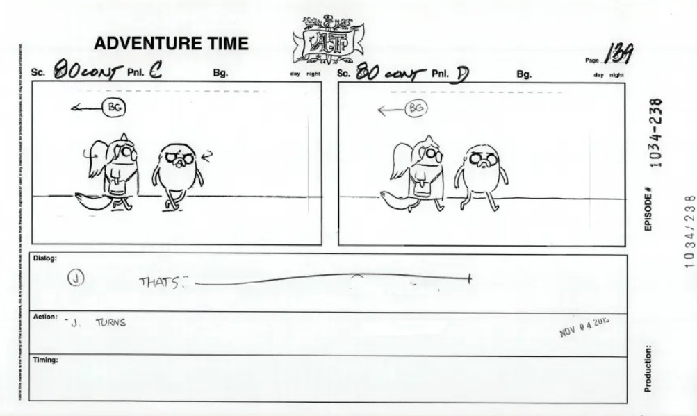 Muto regularly dips his toes into conceptualizing ideas for the series. A lot of these have made their way into the show verbatim (Finn and Jake Banana Guard disguises, Nightmare Princess, BMO and Ice King’s business outfit) while others were expanded upon by other board artists (Fern’s design).