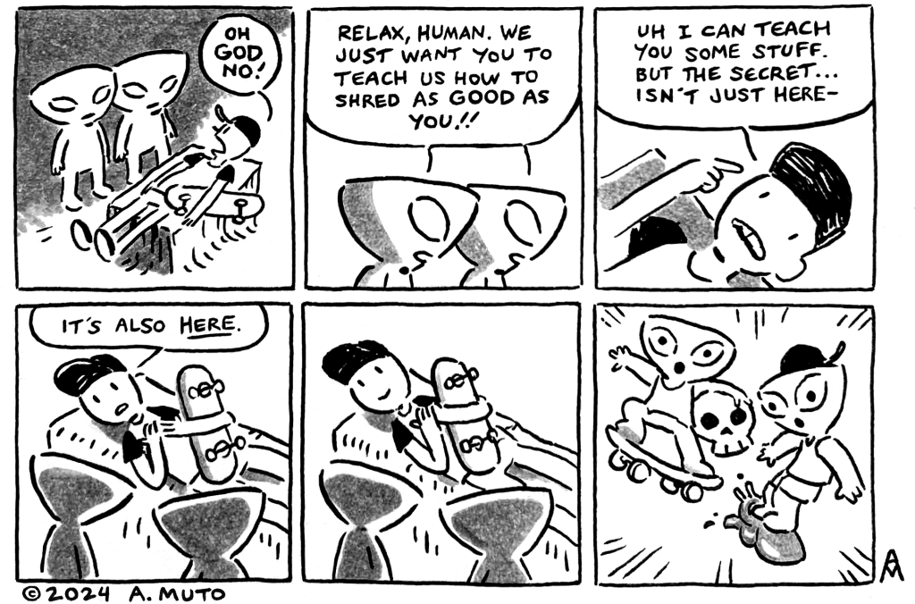 Muto is a comic man most prominently. Most of his style can be analyzed through his two most prominent comic series – Tall Penguin and Future Boyfriend. I’m always impressed by how clean Muto’s linework is, ranging from very simple shapes to more complex designs that never seem to battle each other. Diverging from the hyperrealism of his counterpart, Rebecca Sugar, Muto lends himself to more cartoonish sensibilities. It’s easy to see how Adventure Time has impacted his own look, while also noting the nuances that bleed through in his own boards. Very wide faces, forced perspective, small slants for eyebags, the heightened detail mixed with extreme simplicities. Muto mainly avoids color in his artwork and sticks with a monotone drop.