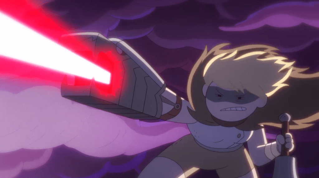 Jay is the most prominent of the Mertens family in this episode, and I’m mostly lukewarm on his presence. He’s involved in this star-crossed lovers’ romance with Little Destiny, which I guess adds a level of stakes for the episode? I dunno, I feel like they already had a decent amount of tension going with the fact that they have the Destiny Gang wanting to abolish magic and Scarab after them at the same time. I’m not really sure how their relationship adds to the episode or the season as a whole – I guess they claim their own destiny (no pun intended) in a way that supports what Fionna, Cake, and Simon are also striving for. Still, I don’t find them super engaging as characters and their bits are pretty standard Romeo & Juliet fodder. They even have Cake working off of them by kind of making fun of their whole shtick, but it’s played pretty straight otherwise. Still, it was all worth it to see Farmworld Finn break out a fuckin’ flamethrower arm and set Destiny Gang members on fire. Man does not fuck around! The breakneck pace of the last few minutes are solid: Cake trying to stretch out but still struggling to use her powers is fun; I love Big Destiny’s lashy, perfect eyes when he has his glasses broken; the final confrontation between Scarab and Farmworld Finn is greatly executed, with an impactful curb stomp that had plenty of people questioning whether FW Finn was killed. I don’t really think that’s what they’re going for, but who knows. I feel like the way the rest of the season pans out leaves me believing this probably isn’t the case and it’d be lame as hell if Finn in ANY universe was taken out in such an unceremonious way. This farm boy needs to go down in flames! Also, I didn’t know where else to add this in, but does anyone have any thoughts about Simon mentioning that the crown smells like freshly cut grass? I guess it could just be a throwaway line, but it felt too random to be that. Haven’t seen any theories otherwise, though.
