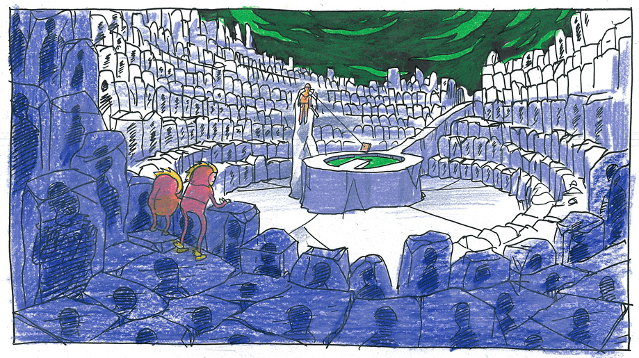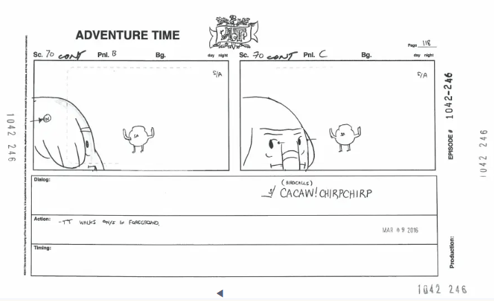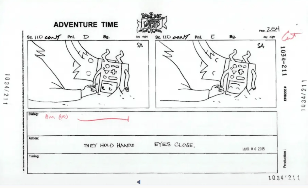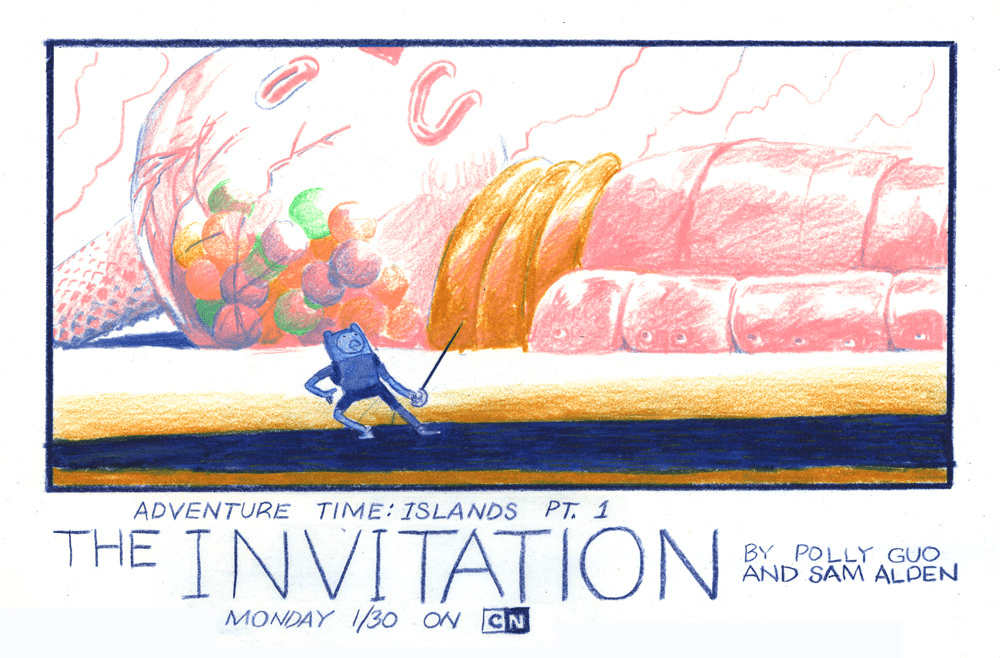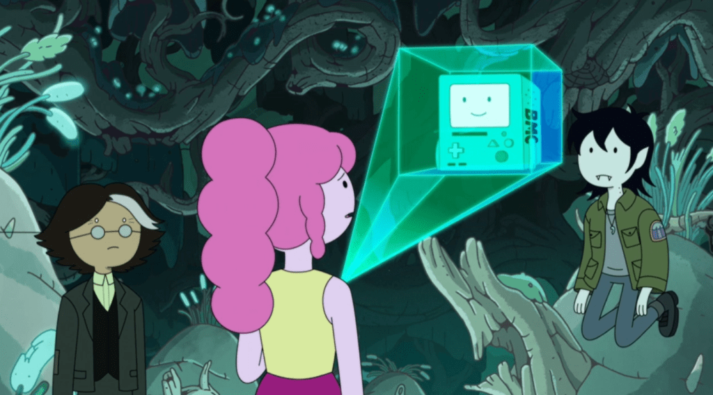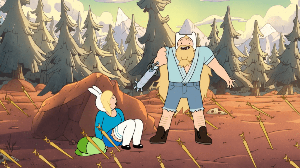 Let’s jump around a bit and start with the cosmic stuff. It’s great to see Orbo again, as well as the other gods (y’all know my affinity for God Lard). Fionna and Huntress are judged by Orbo for their crime of killing the Cosmic Owl, which leads me to believe that the Citadel is indeed no longer functional after the events of Escape From the Citadel. Ratted out by, of course, Scarab. I really didn’t like Scarab as a main antagonist last season, but I enjoy the little inclusion of him as more of a secondary villain. He’s just such a hammy little stick in the mud that it’s hard not to get behind his obsessive tendencies towards law and order and his dramatic patterns of speech. Most of the trial itself is very funny, with some great lines from Fionna herself: “I’ve seen like, five episodes of Night Court,” “call my fake dad!” and “eyewitness accounts are wrong like, 70% of the time.” There’s a brief clip of Rumble Jaw that Scarab flips onto in the Time Room, which was the fake project that the AT team whipped up to disguise that Distant Lands was in the works. My boy Party God gets to join in the fun! There’s also a brief “Jesus” mention from Orbo, which we’ve seen in the Fionna-World segments, but never beyond that world. I’m probably the only one who cares about something like that, but the implication of there being a Jesus in this world is way too funny/intriguing to me. Brief aside, if you are also into that concept, check Jesse Moynihan’s recent pilot. It’s a completely bonkers exploration of a dystopian future, and if you love the more heady bits of Adventure Time, I think this will be right up your alley.