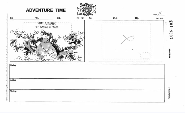 Known for his love of tabletop games and general affinity for the pups, King of Ooo, and the 1000+ Ooo-scape, Steve Wolfhard started out as a board revisionist before becoming a full-time board artist at the start of season 5. His partnership with Tom Herpich has been the longest running board team for the entirety of the series, and despite their general overlapping interests (Tree Trunks, Finn and Jake’s brotherhood, Finn being kind of stupid) Wolfhard’s style largely contrasts Herpich when it comes to design.