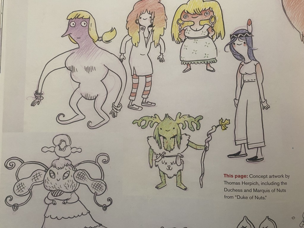 This section isn’t entirely unique from the one before it, as the pups make their way into the 1000+ lore. Wolfhard got to build the visual look for the 1000+ world pretty much from scratch, and most of his character concepts made it into the actual show, with the exception of Wintergreen and Clover, the possum standing on Sweet P’s head.