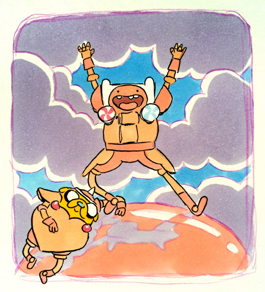 Wolfhard’s squiggly outlines and flat color are prominent in most of his artwork – concepts included. Wolfhard has maybe created the most concept artwork for the series, with a blend of ideas he conjured up for the episodes he’s worked on (Finn and Jake’s KOO armor, the adult pups) while others involve oddball pitches that don’t get off the floor (Finn dating the Mona Lisa, King of Ooo dating an androgynous blue figure). Some of these oddball ideas do end up making their way into the series later in the process (Slime Princess growing huge, King of Ooo being a little waxman).